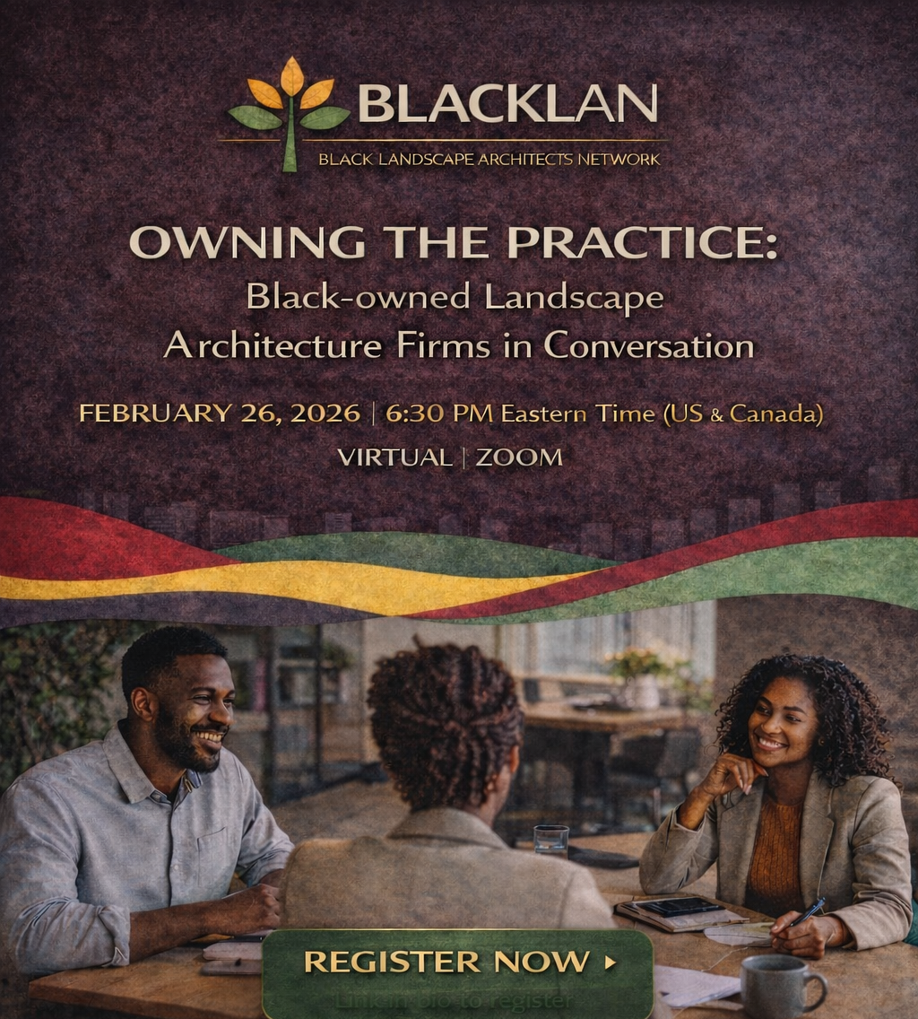 BlackLAN invites you to join us for a virtual panel discussion centered on Black-owned landscape architecture firms and the realities of ownership, leadership, and professional growth.